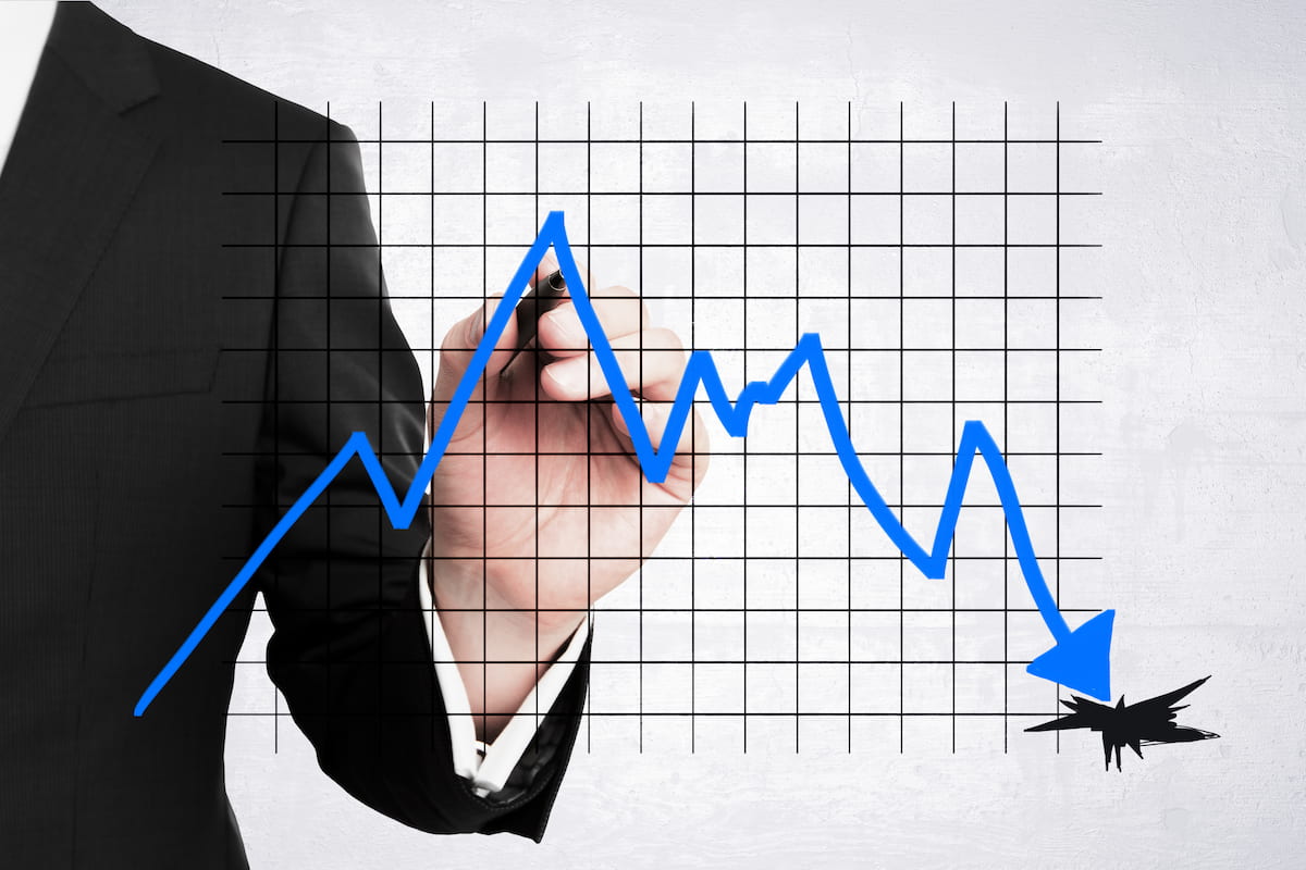 Foto/Divulgação: https://br.freepik.com/fotos-premium/close-up-de-um-empresario-desenhando-a-mao-um-abstrato-para-baixo-caindo-em-um-buraco-grafico-de-negocios-com-esboco-de-flecha-na-grade-e-fundo-de-parede-de-concreto-conceito-de-crise-financeira-e-para-baixo_233562347.htm